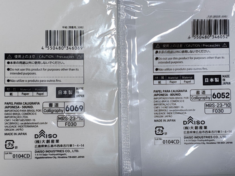左側が清書用で右側が練習用。練習用の半紙のほうが白っぽいです。