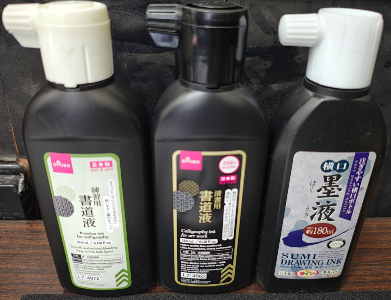 おまけ・一番右は2000年代頭に買ったダイソーの墨液です。どれも180mlで昔から容量は変わっていないようです。