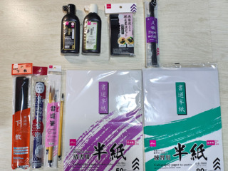 今回は墨汁を2種類、硯、文鎮、下敷き、ふでまき、2本セットの筆、清書用半紙、練習用半紙を買ってみました。