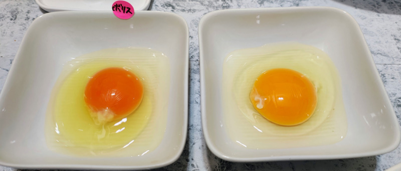 ちなみにこちらはボリスブラウンとスーパーで買ってきた白玉の比較。黄身の色が全然違いました。