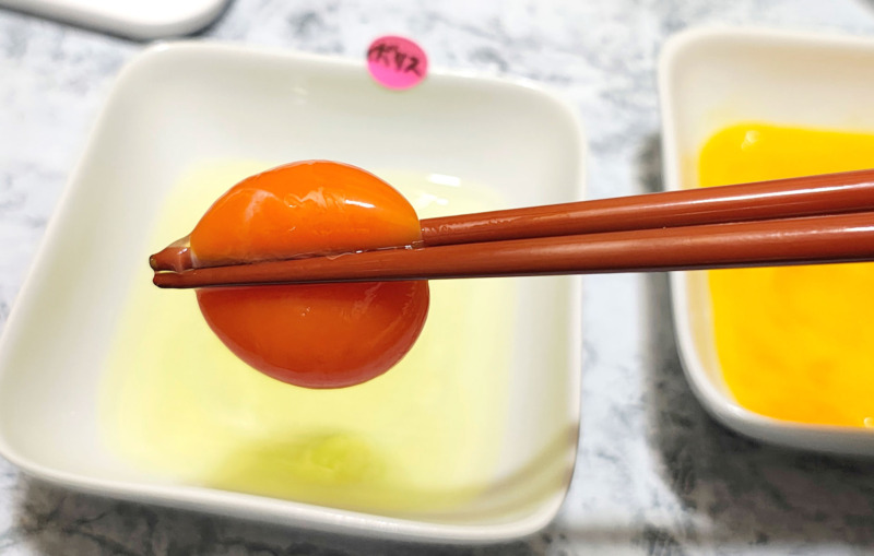 黄身の強さ?はというと箸でつまんで持ち上げられますが、箸の先端が黄身に当たると膜がやぶけて中身が飛び出してしまうぐらい。